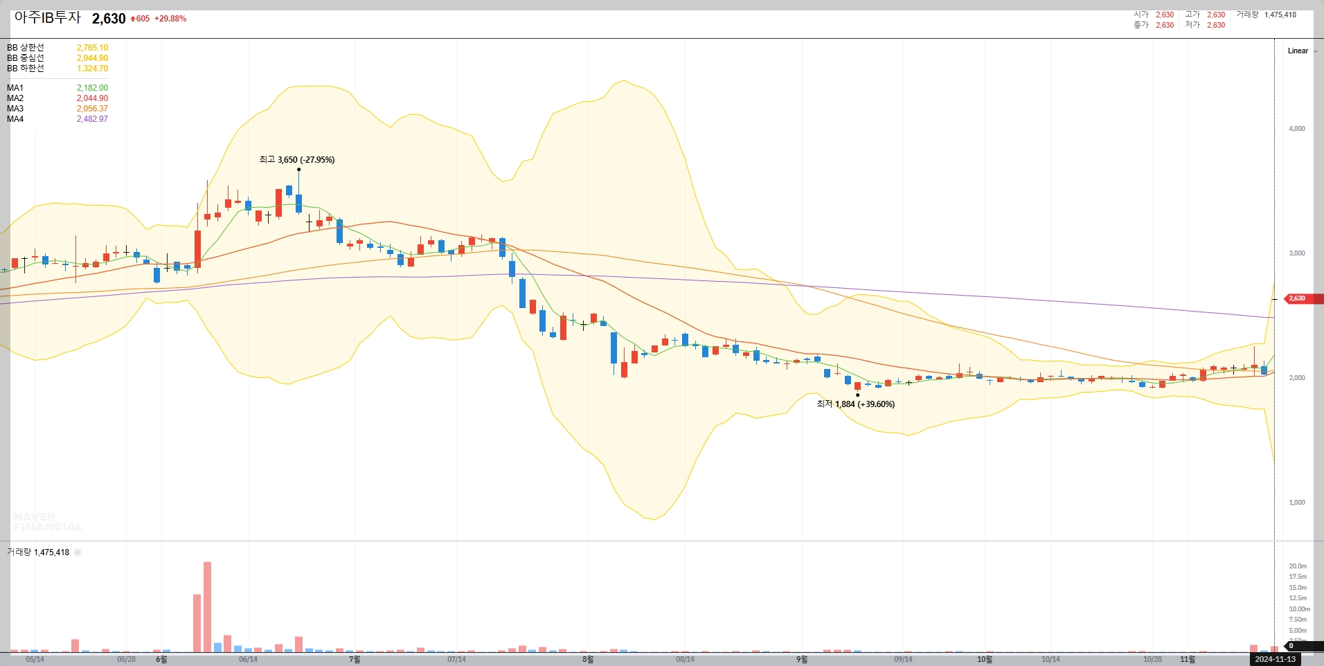 아주IB투자의 현재 주가는 2,630원으로 전일 대비 29.88% 상승했습니다. 이는 스페이스X 투자 소식이 전해지면서 장 초반부터 상한가를 기록한 결과입니다. 최근 몇 달간 박스권에서 횡보하던 주가는 이번 뉴스로 인해 급격한 상승세를 보이고 있습니다.