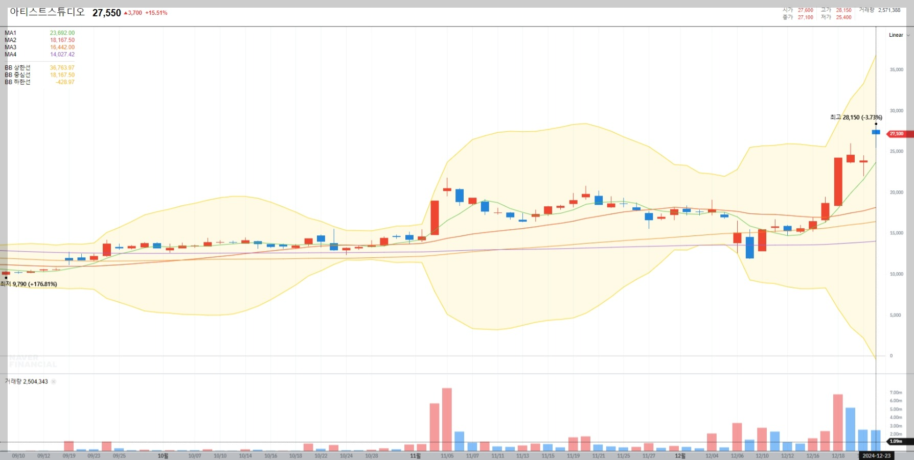 2024년 12월 23일 기준으로 아티스트스튜디오는 투자자들 사이에서 큰 관심을 받고 있는 종목입니다. 본 글에서는 아티스트스튜디오의 기업 개요, 최근 뉴스, 현재 주가 동향, 볼린저밴드 매매기법 분석, 재무 지표를 기반으로 한 종합적인 주가 전망과 목표 주가를 살펴보겠습니다.
