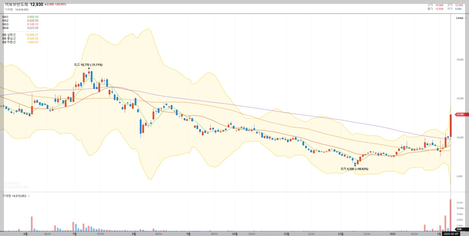 2025년 2월 7일 기준 어보브반도체의 종가는 12,930원으로 하루 만에 29.95% 상승하며 상한가를 기록했습니다. 이는 최근 긍정적인 뉴스와 투자자들의 기대감이 반영된 결과로 보입니다.