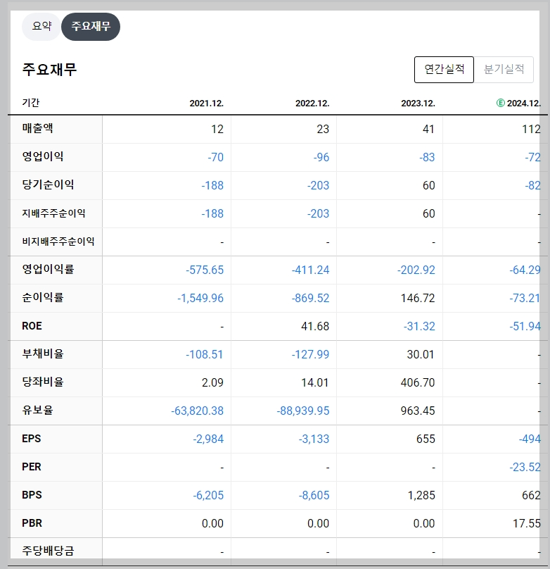 2024년 예상 매출액은 112억 원으로 전년 대비 약 173% 증가할 것으로 보입니다. 그러나 영업손실은 지속되고 있어 흑자 전환까지는 시간이 필요할 것으로 예상됩니다.