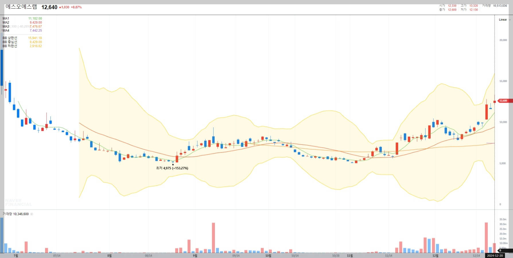 2024년 12월 20일 기준으로 에스오에스랩의 종가는 12,640원으로 전일 대비 8.87% 상승했습니다. 이는 최근 거래량 증가와 함께 투자 심리가 개선된 결과로 보입니다.