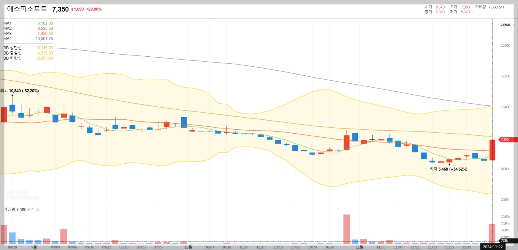 2024년 11월 22일 기준, 에스피소프트는 마이크로소프트와의 협력으로 AI 사업 매출이 증가하며 상한가(29.86%)를 기록했습니다. 클라우드 기반의 신규 사업 확장과 AI 관련 매출 본격화가 긍정적인 영향을 미쳤습니다.