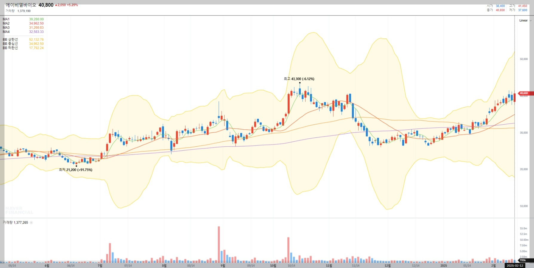 2025년 2월 12일 기준, 에이비엘바이오의 주가는 40,800원으로 전일 대비 5.29% 상승했습니다. 최근 몇 달간 상승세를 보이며 투자자들의 관심을 끌고 있으며, 거래량도 꾸준히 증가하고 있습니다.