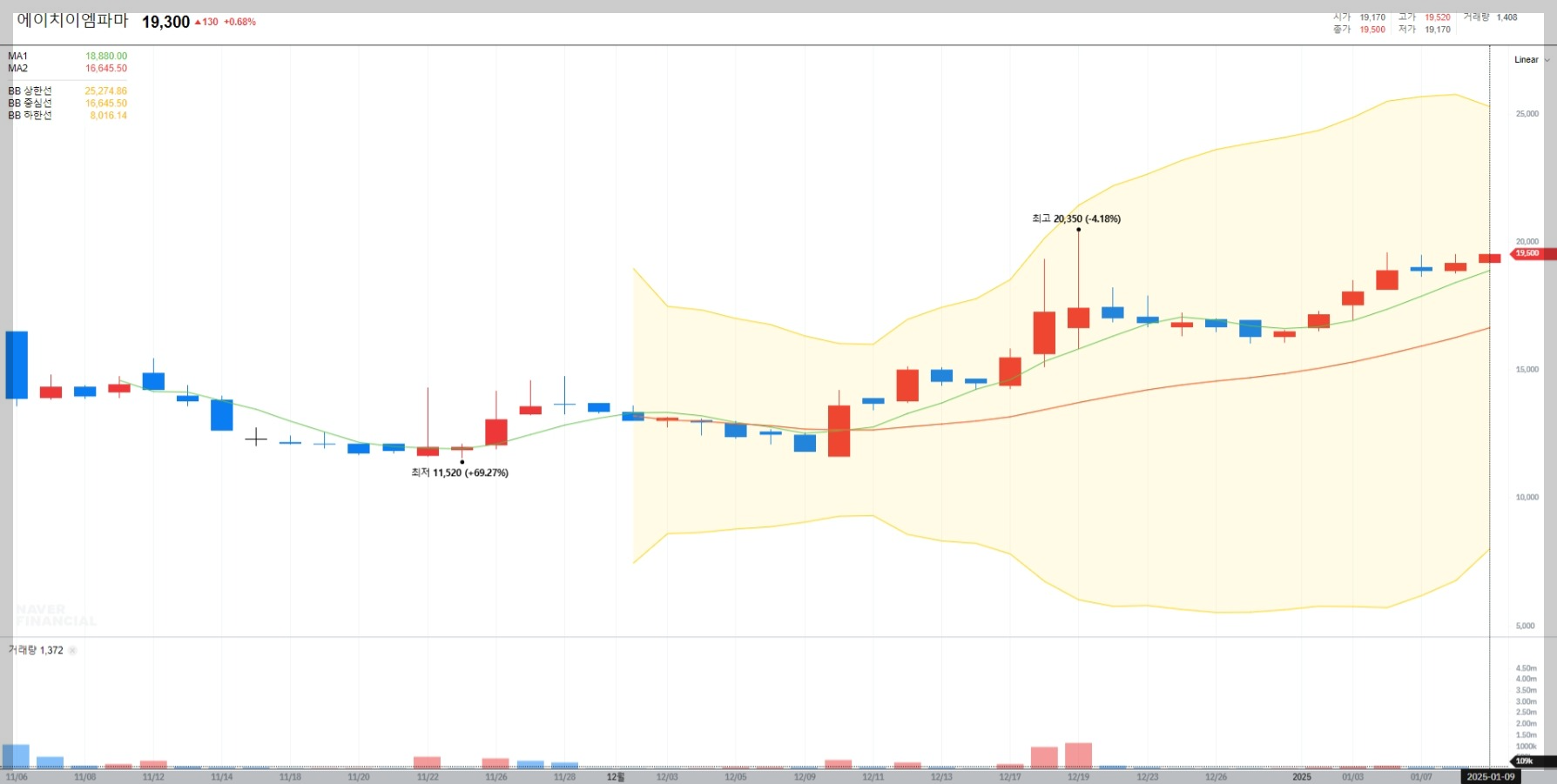 볼린저밴드는 주가 변동성을 측정하는 기술적 지표로, 상한선과 하한선을 활용해 매수 및 매도 시점을 판단합니다. 에이치이엠파마의 최근 차트를 보면 볼린저밴드 상단 돌파 구간에서 상승세를 보였으나 이후 조정을 겪고 있습니다. 현재 밴드 폭 확장이 나타나고 있어 변동성 확대 가능성이 큽니다.