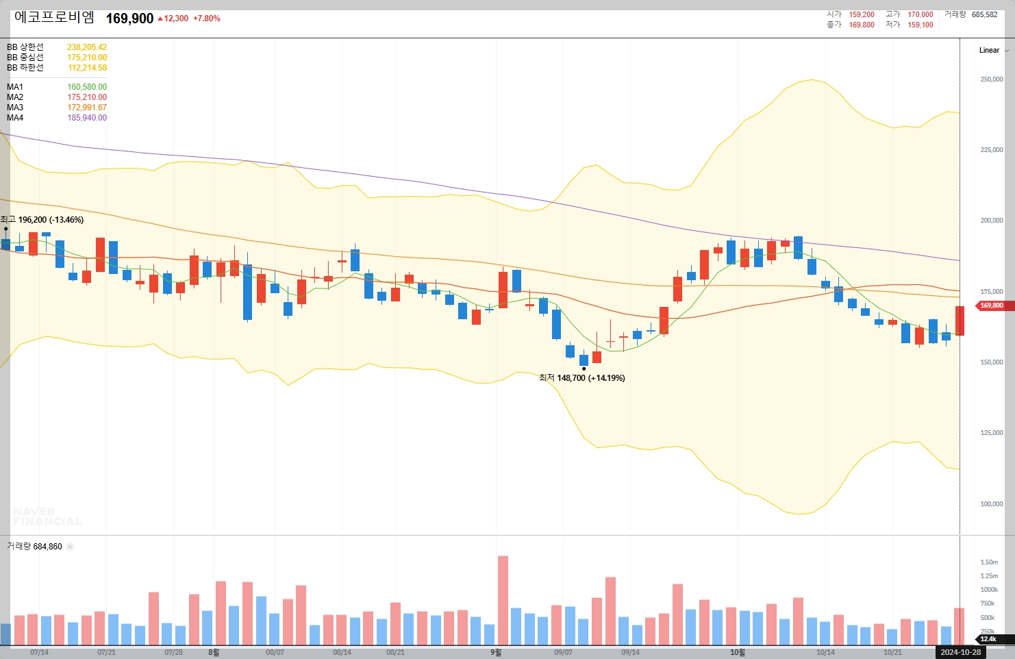 2024년 10월 28일 현재, 에코프로비엠의 주가는 169,900원으로, 전일 대비 7.80% 상승한 것으로 나타났습니다.