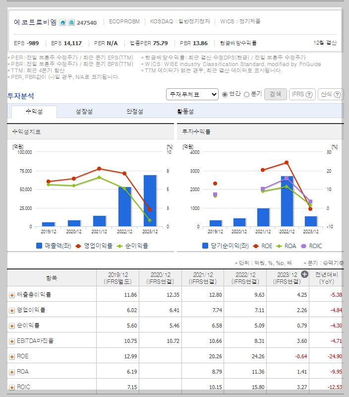 -2024년 3월 전년동기 대비 연결기준 매출액은 51.7% 감소, 영업이익은 93.8% 감소, 당기순이익 적자전환. 주요국의 전기차 보조금 축소, 얼리어답터의 전기차 구매 포화, 건설경기 둔화로 인한 파워툴용 양극재 판매가 부진함. SNE 리서치에서 발표한 자료에 따르면, 글로벌 전기차 판매는 2023년 1,374만 대에서 2030년 4,204만 대, 2035년에는 7,412만 대까지 판매될 것으로 전망.