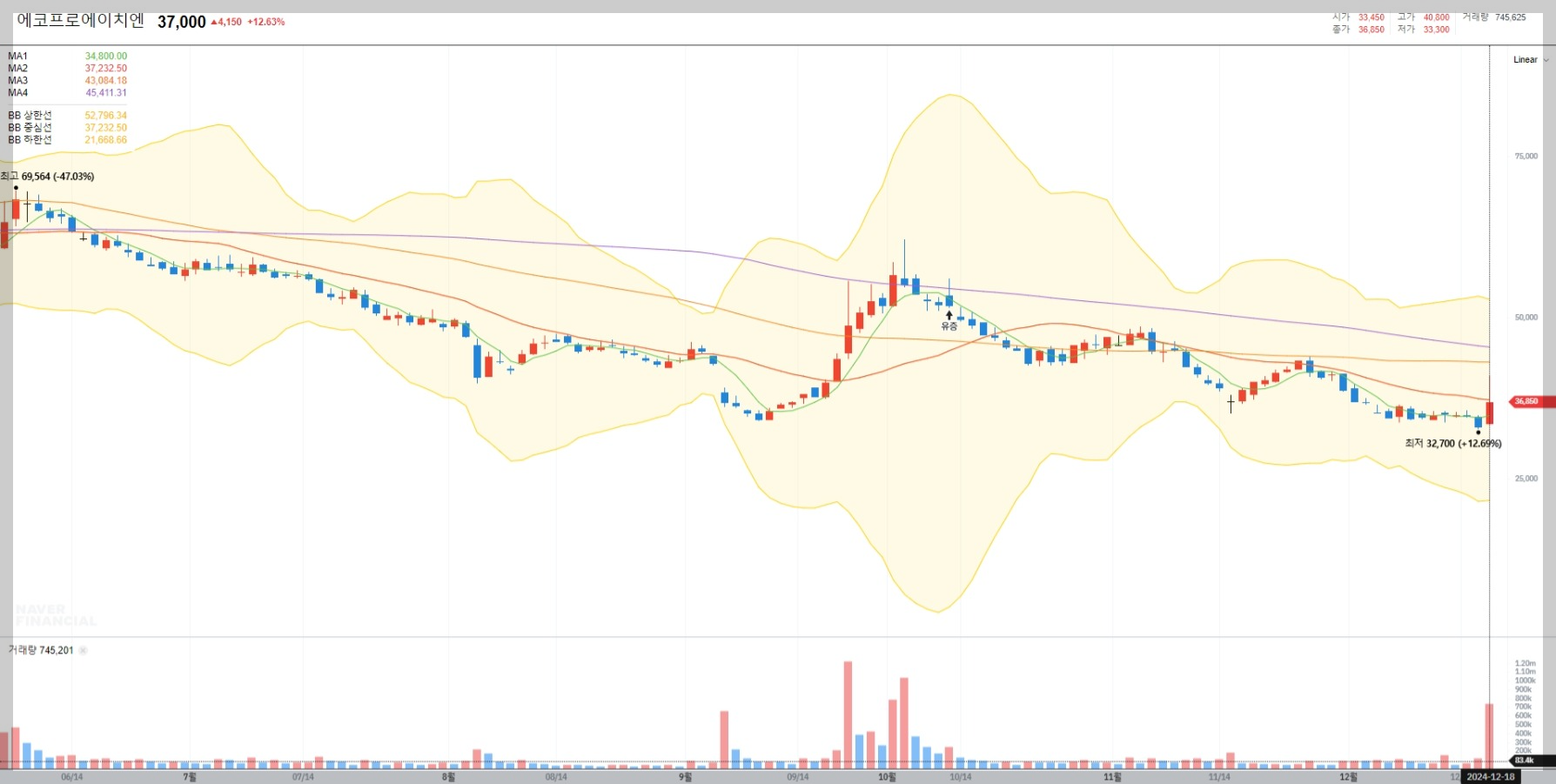 2024년 12월 18일 기준 에코프로에이치엔의 주가는 37,000원으로 전일 대비 12.63% 상승했습니다. 거래량도 급증하며 투자자들의 관심이 집중되고 있습니다.