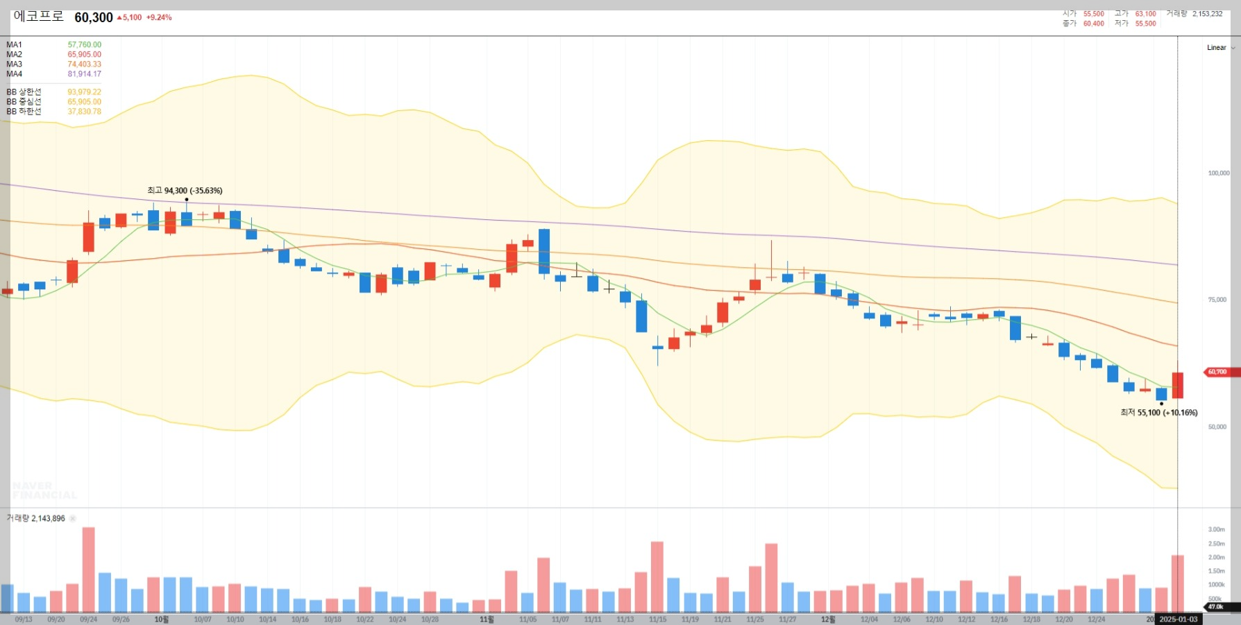 2025년 1월 3일 기준 에코프로의 종가는 60,300원으로 전일 대비 상승세를 보였습니다. 최근 2차 전지 업종의 부진한 흐름 속에서도 반발 매수세 유입이 관찰되었으나 단기 변동성은 여전히 존재합니다.