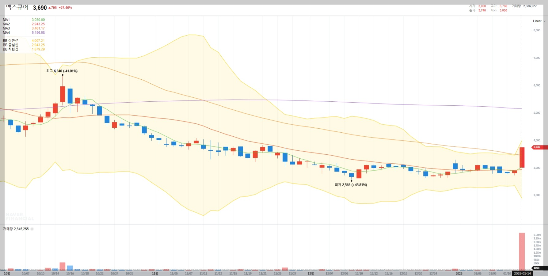 2025년 1월 14일 기준, 엑스큐어의 주가는 3,690원으로 전일 대비 27.46% 상승하며 거래되고 있습니다. 이는 최근 자금 조달 및 신사업 기대감에 따른 투자자들의 긍정적 반응으로 분석됩니다.