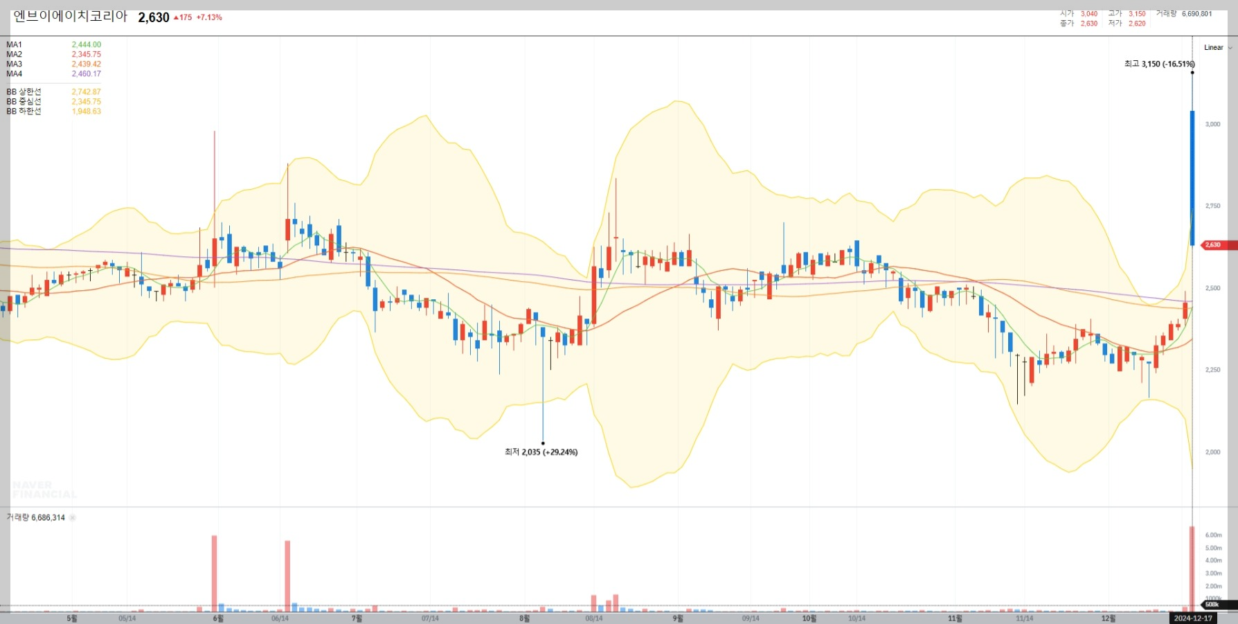 2024년 12월 17일 기준 엔브이에이치코리아의 주가는 22.4% 상승하며 3,005원에 거래되고 있습니다. 이는 정치적 테마와 관련된 이슈와 더불어 회사의 실적 개선 기대감이 반영된 결과로 보입니다.