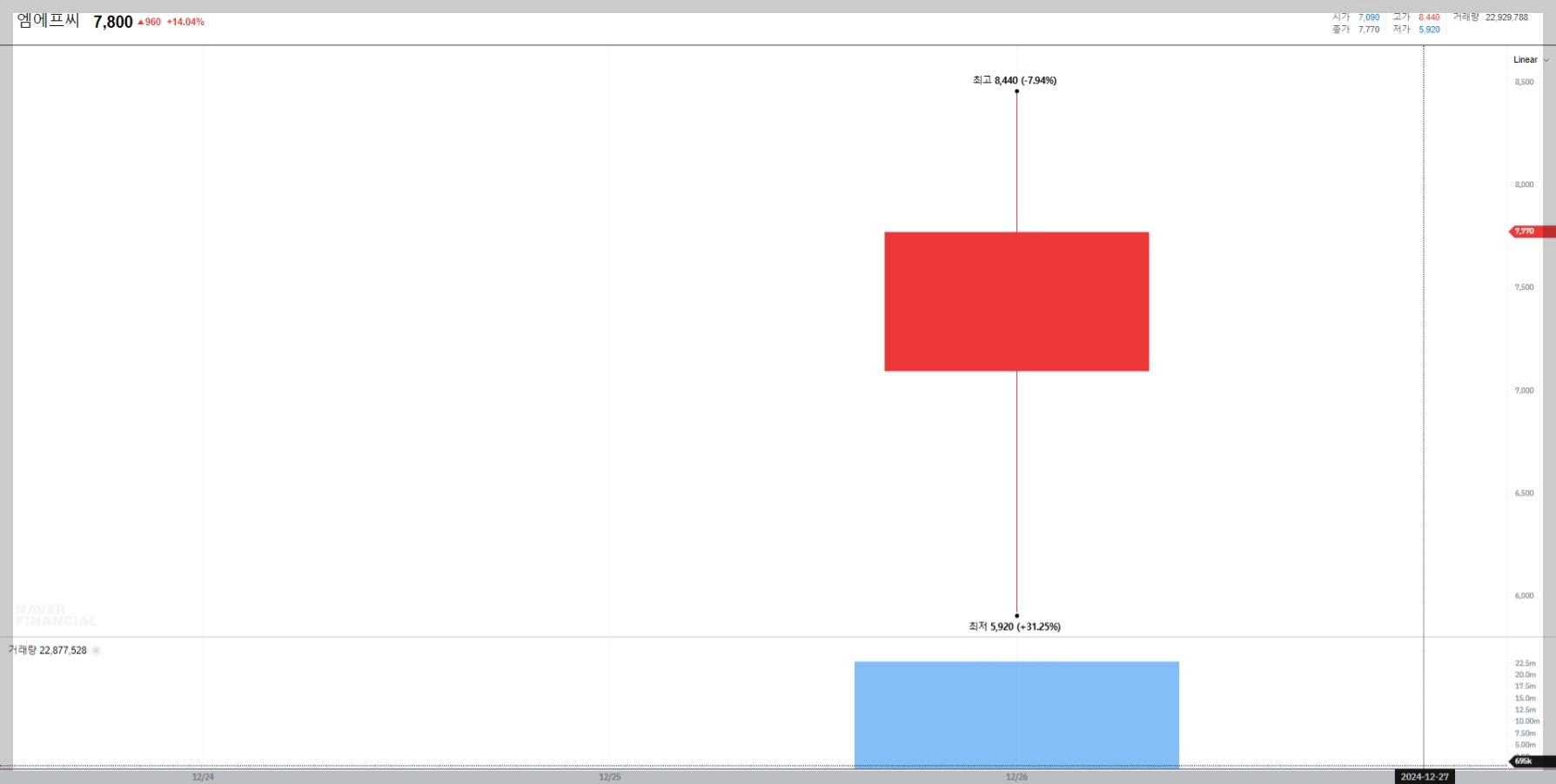 12월 26일 기준 엠에프씨의 주가는 7,800원으로 상장 첫날 변동성을 보였습니다. 거래량은 약 22.9백만 주로 활발한 거래가 이루어졌습니다.