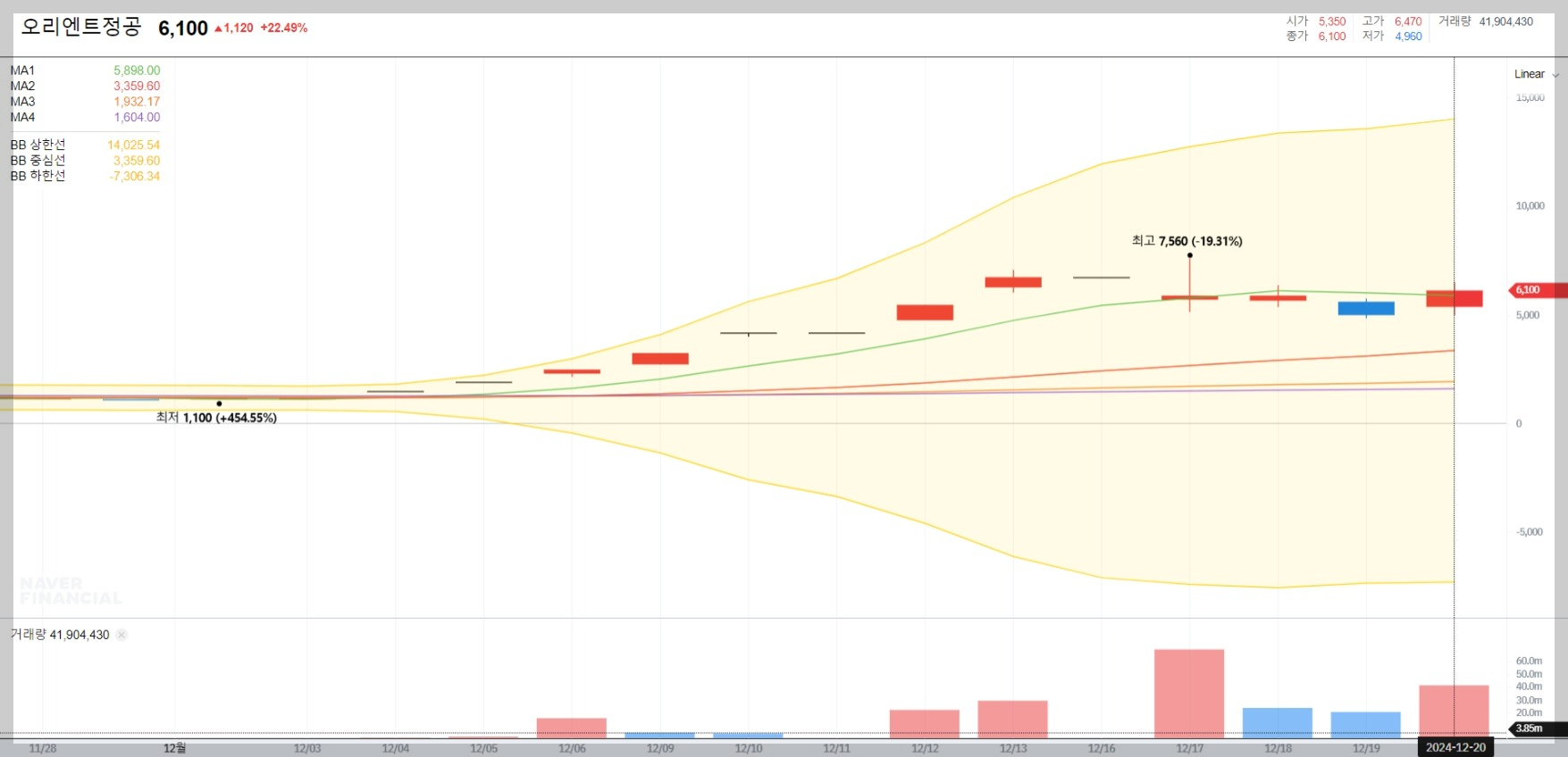 최근 오리엔트정공의 주가는 단기간에 급등하며 시장의 이목을 끌었습니다. 특히 2024년 12월 20일 기준으로 전일 대비 22.49% 상승하여 6,100원을 기록했습니다. 이는 거래량 증가와 함께 투자 심리가 개선된 결과로 보입니다.