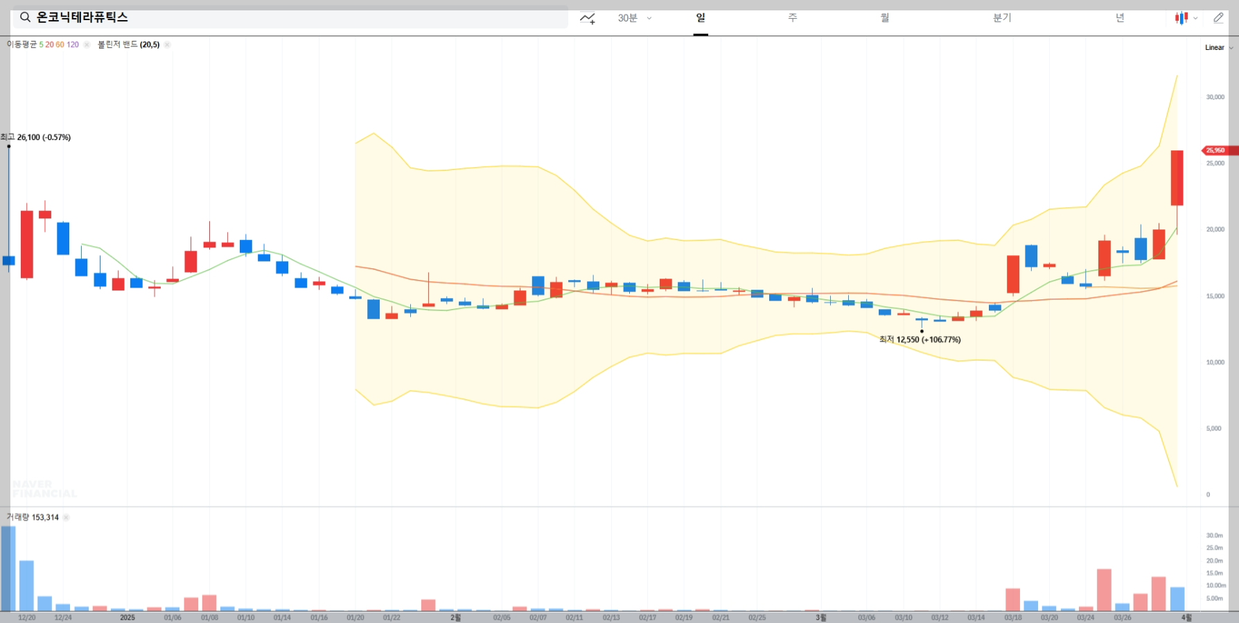 온코닉테라퓨틱스 주가는 현재 볼린저밴드 상단을 돌파한 상태로, 강한 매수 신호를 보이고 있습니다. 20일 이동평균선을 기준으로 상단 밴드를 크게 상회하고 있어 단기적으로 과매수 상태에 진입했다고 볼 수 있습니다.
