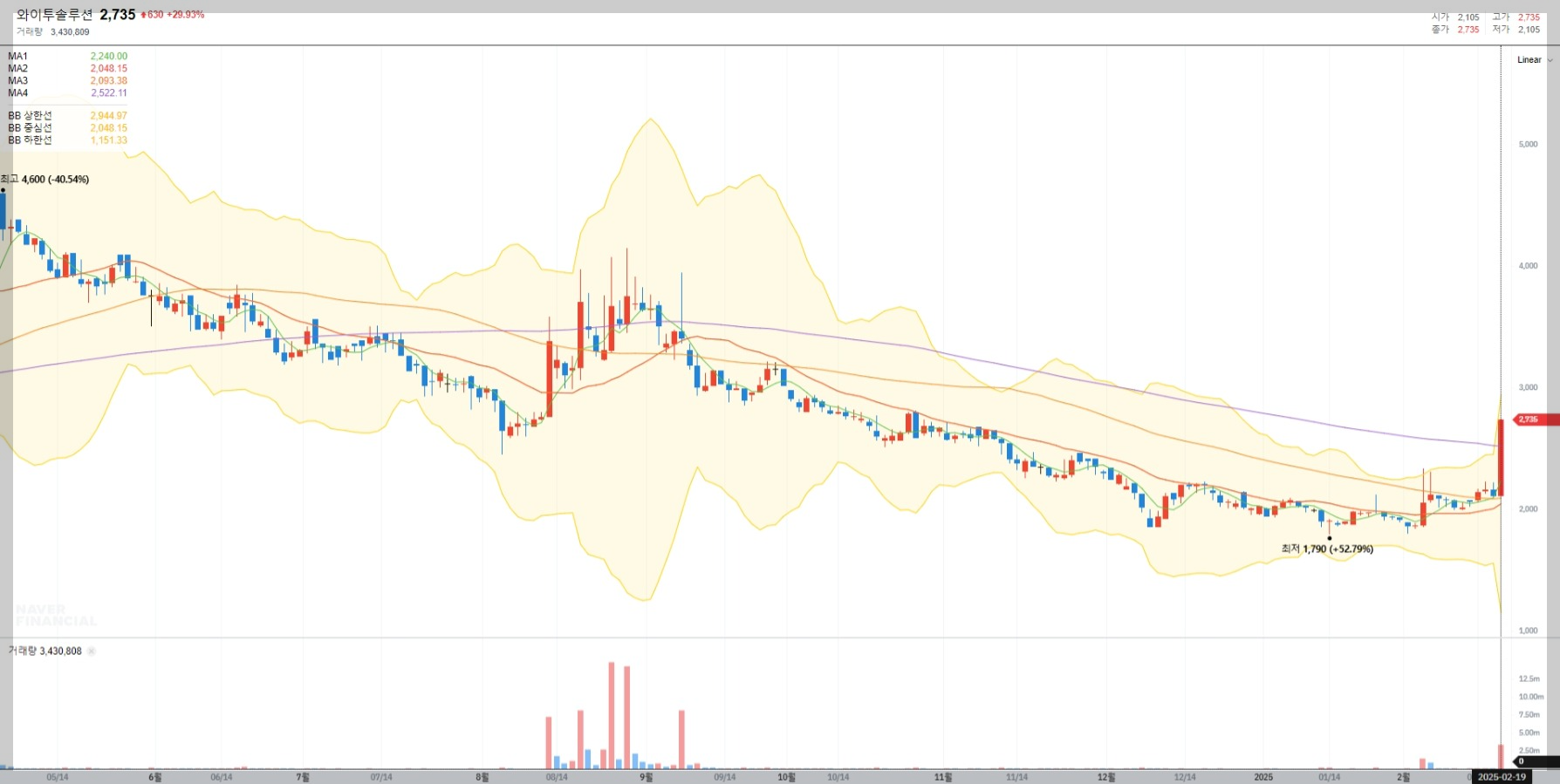 현재 와이투솔루션의 주가는 2,735원으로 최근 급등세를 보였습니다. 이는 단기적인 거래량 증가와 기술적 반등에 기인한 것으로 보이며, 투자자들의 관심이 집중되고 있는 상황입니다.