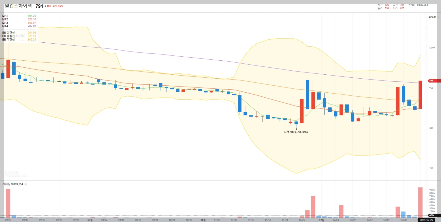 12월 26일 장중 웰킵스하이텍의 주가는 794원으로 전일 대비 29.95% 상승했습니다. 이는 투자 심리가 개선되고 구조조정 효과에 대한 기대감이 반영된 결과로 보입니다.