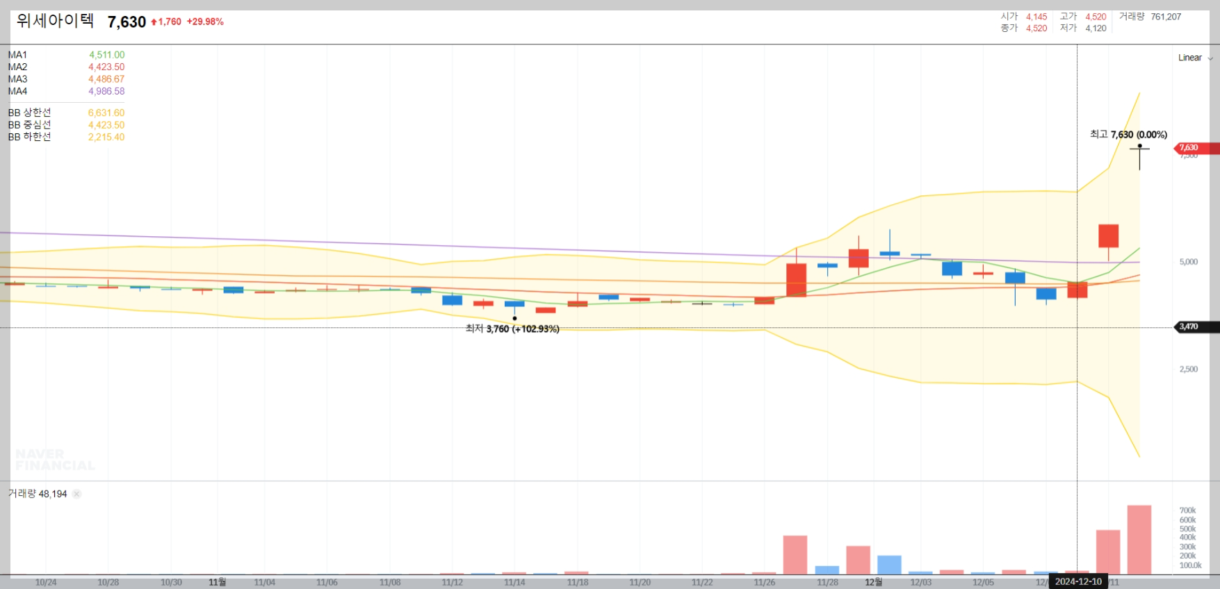 볼린저밴드는 가격 변동성을 측정하는 기술적 지표로 사용됩니다. 위세아이텍의 경우, 볼린저밴드를 활용한 매매 전략이 유효할 수 있으며, 이는 주가의 추세를 파악하는 데 도움을 줍니다.
