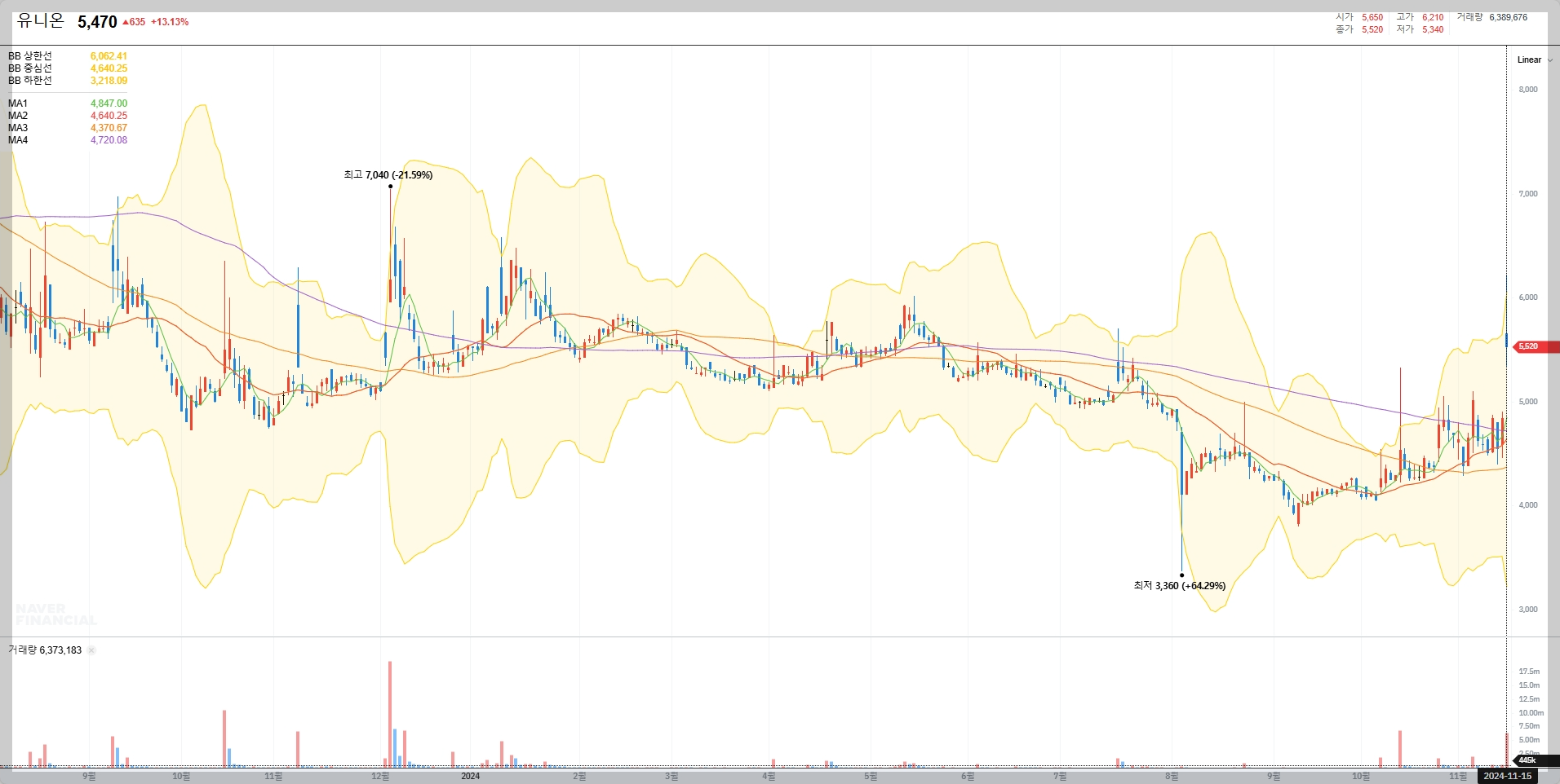 2024년 11월 15일 기준으로 유니온의 주가는 5,470원으로 전일 대비 13.13% 하락했습니다. 최근 주가는 변동성이 크며, 최고가는 7,040원(21.59% 상승), 최저가는 3,360원(64.29% 하락)을 기록한 바 있습니다.