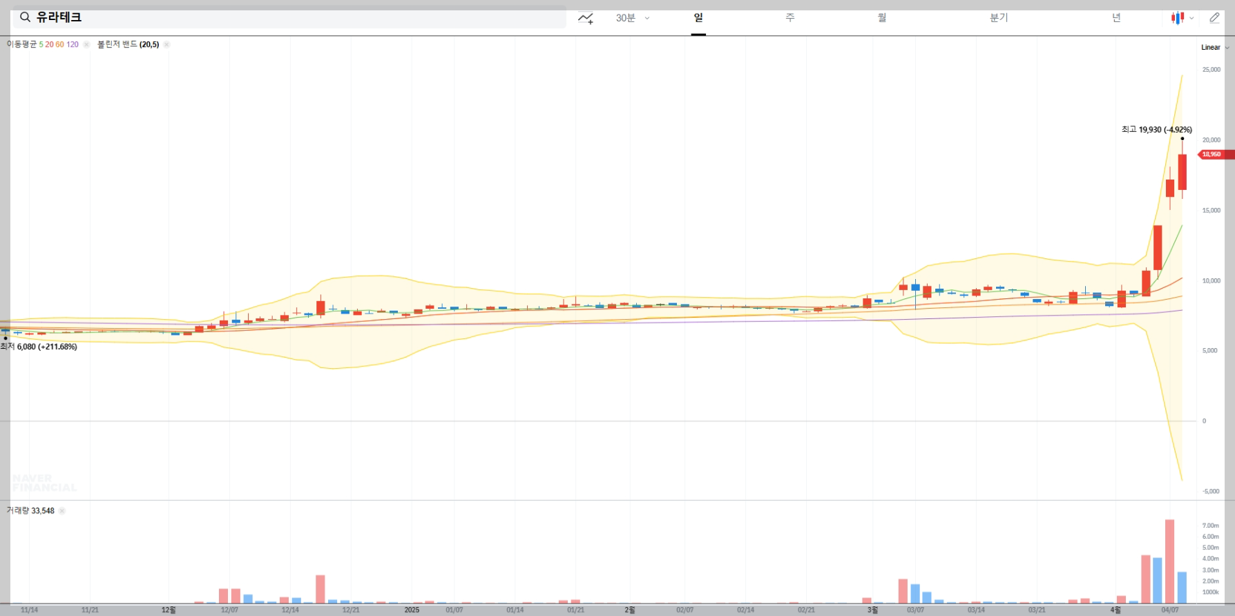 볼린저밴드 분석 결과, 유라테크 주가는 상단밴드에 근접해 있어 단기적으로 과매수 상태일 수 있습니다. 그러나 추세의 강도를 고려할 때, 추가 상승 여력도 존재합니다.