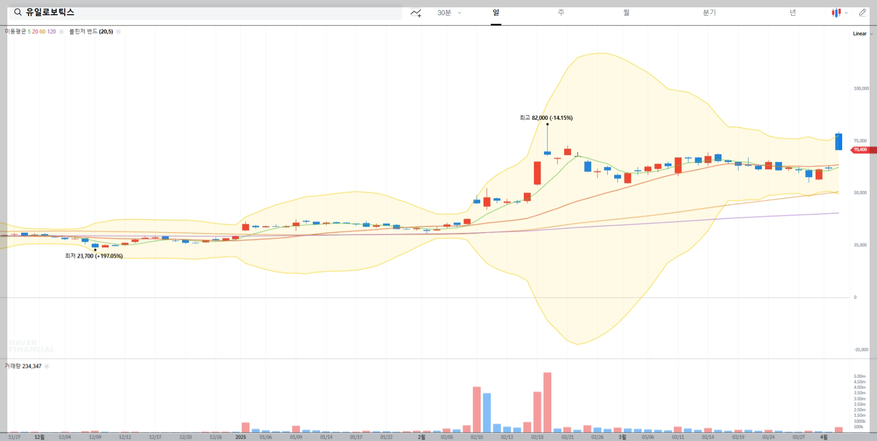 볼린저밴드 분석에 따르면, 유일로보틱스 주식은 현재 상단밴드를 돌파한 상태입니다. 이는 단기적으로 과매수 구간에 진입했음을 의미할 수 있습니다. 20일 이동평균선을 기준으로 상단밴드를 돌파한 후 거래량이 증가하는 패턴은 강한 모멘텀을 나타내지만, 단기 조정 가능성도 염두에 둬야 합니다.
