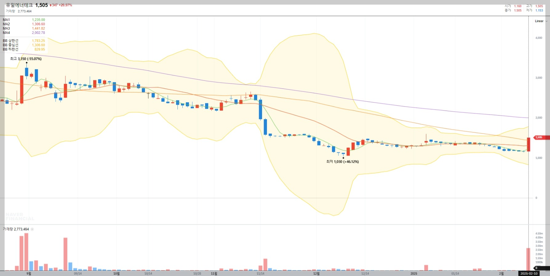 2025년 2월 10일 기준, 유일에너테크의 주가는 1,505원으로 상한가를 기록했습니다. 이는 최근 전고체 배터리 관련 수주 소식과 맞물려 강력한 매수세가 유입된 결과로 보입니다.