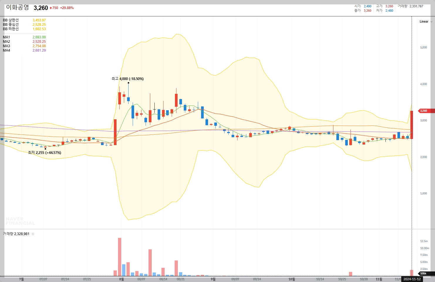 이화공영의 현재 주가는 3,260원(2023년 11월 12일 기준)입니다. 52주 최고가 4,000원, 최저가 2,255원을 기록하며, 현재는 중간 정도의 레벨에서 거래되고 있습니다.
