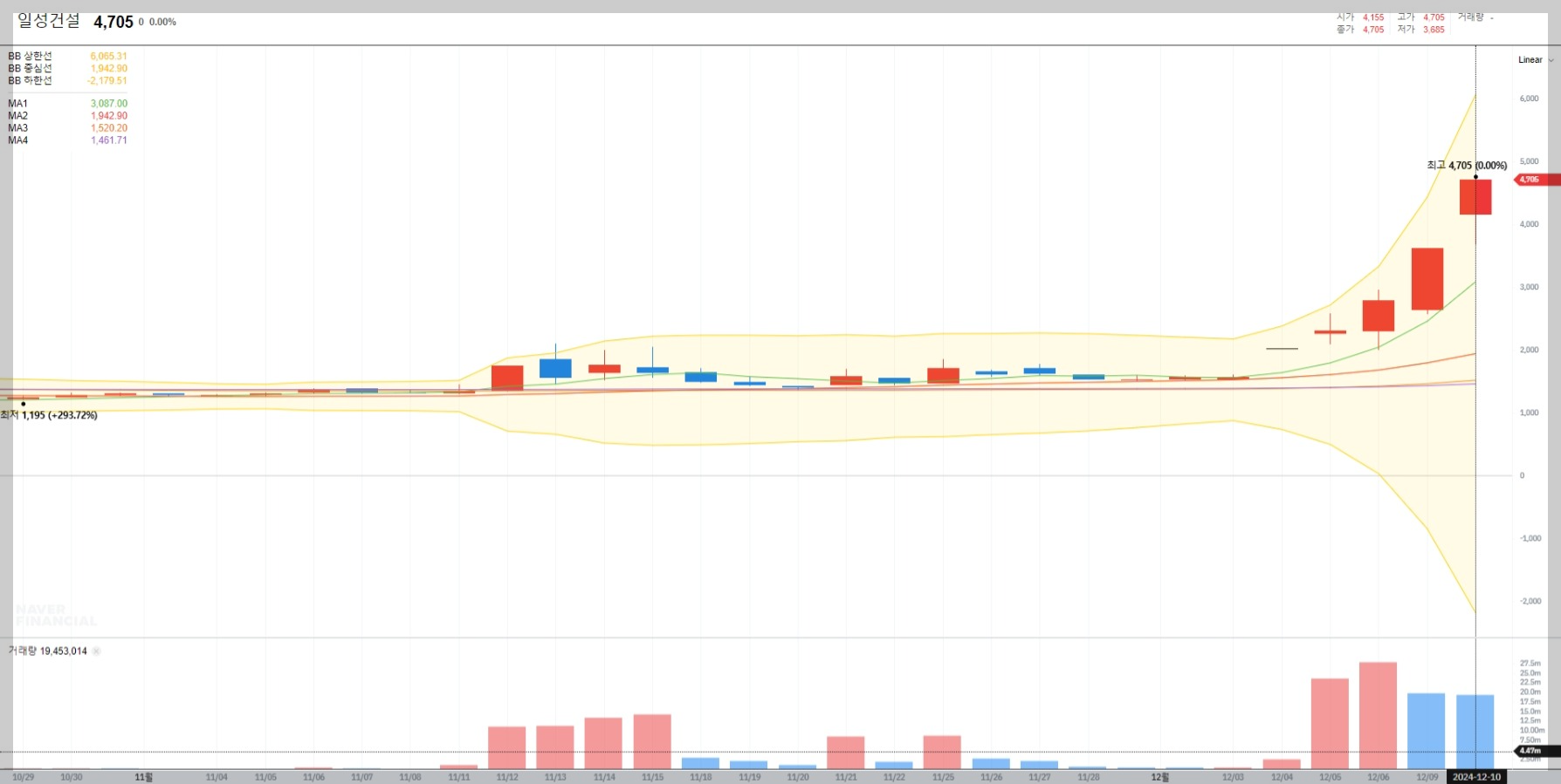 현재 일성건설의 주가는 4,705원으로 최근 몇 거래일 동안 급등세를 보였습니다. 특히 거래량 증가와 함께 강한 상승세를 기록하며 기술적 지표상 과매수 구간에 진입한 상태입니다.