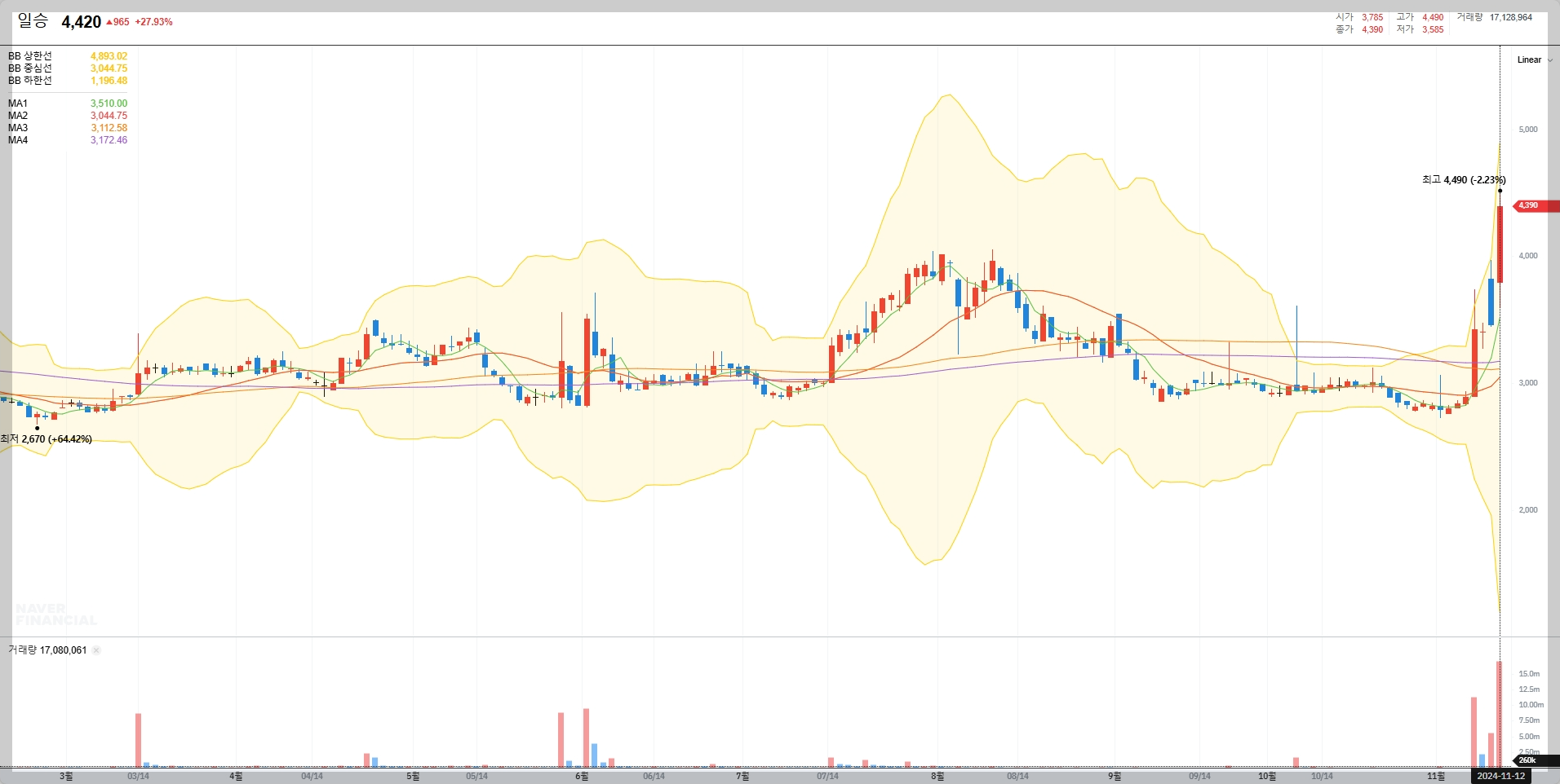 2024년 11월 12일 기준, 일승의 주가는 4,420원입니다. 최근 3개월간 약 20% 상승하며 강세를 보이고 있습니다.