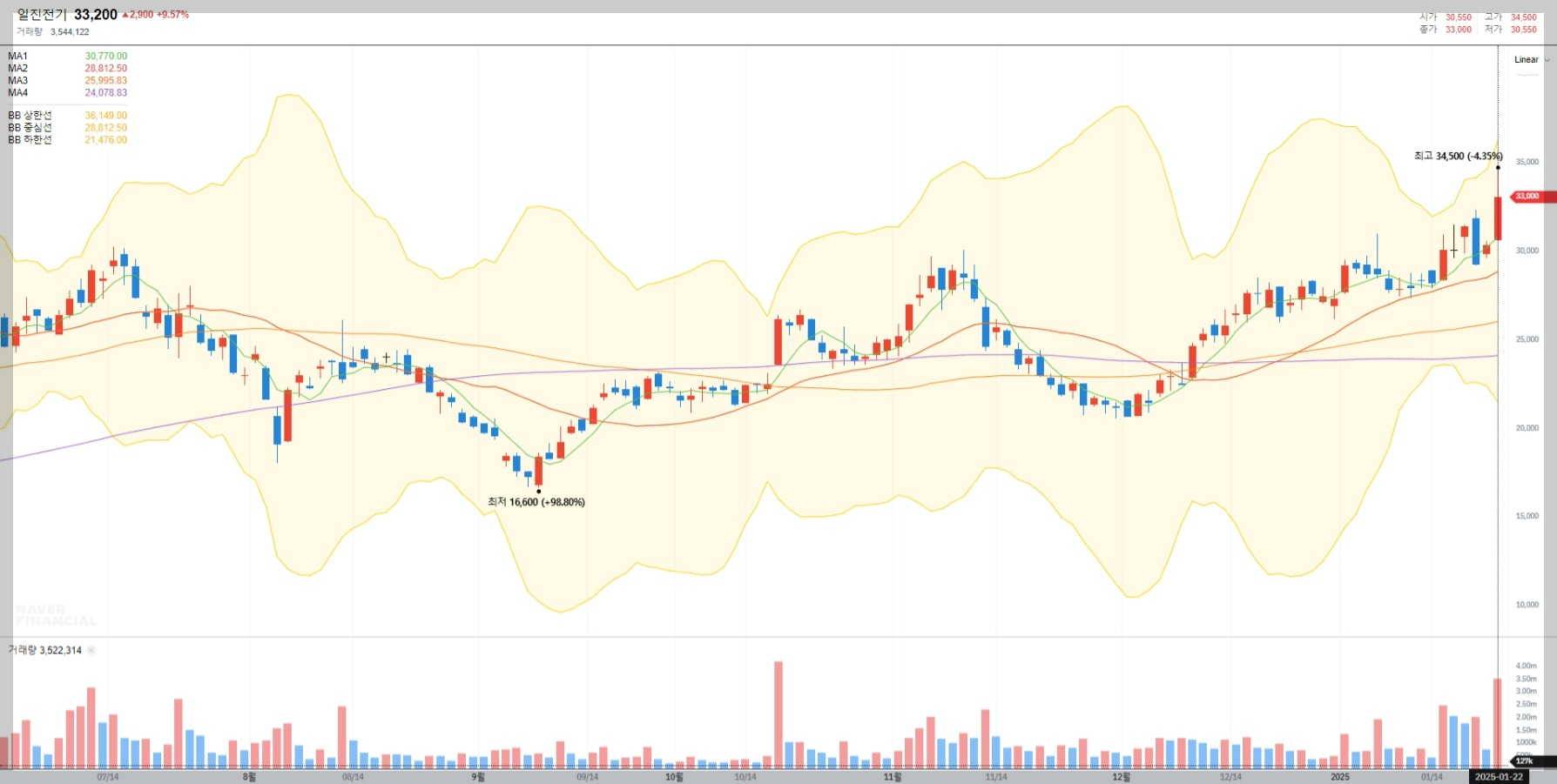 2025년 1월 기준 일진전기의 주가는 33,200원으로 최근 상승세를 보이고 있습니다. 이는 글로벌 수주 증가와 초고압 변압기 수요 확대에 따른 긍정적인 시장 반응 때문입니다.