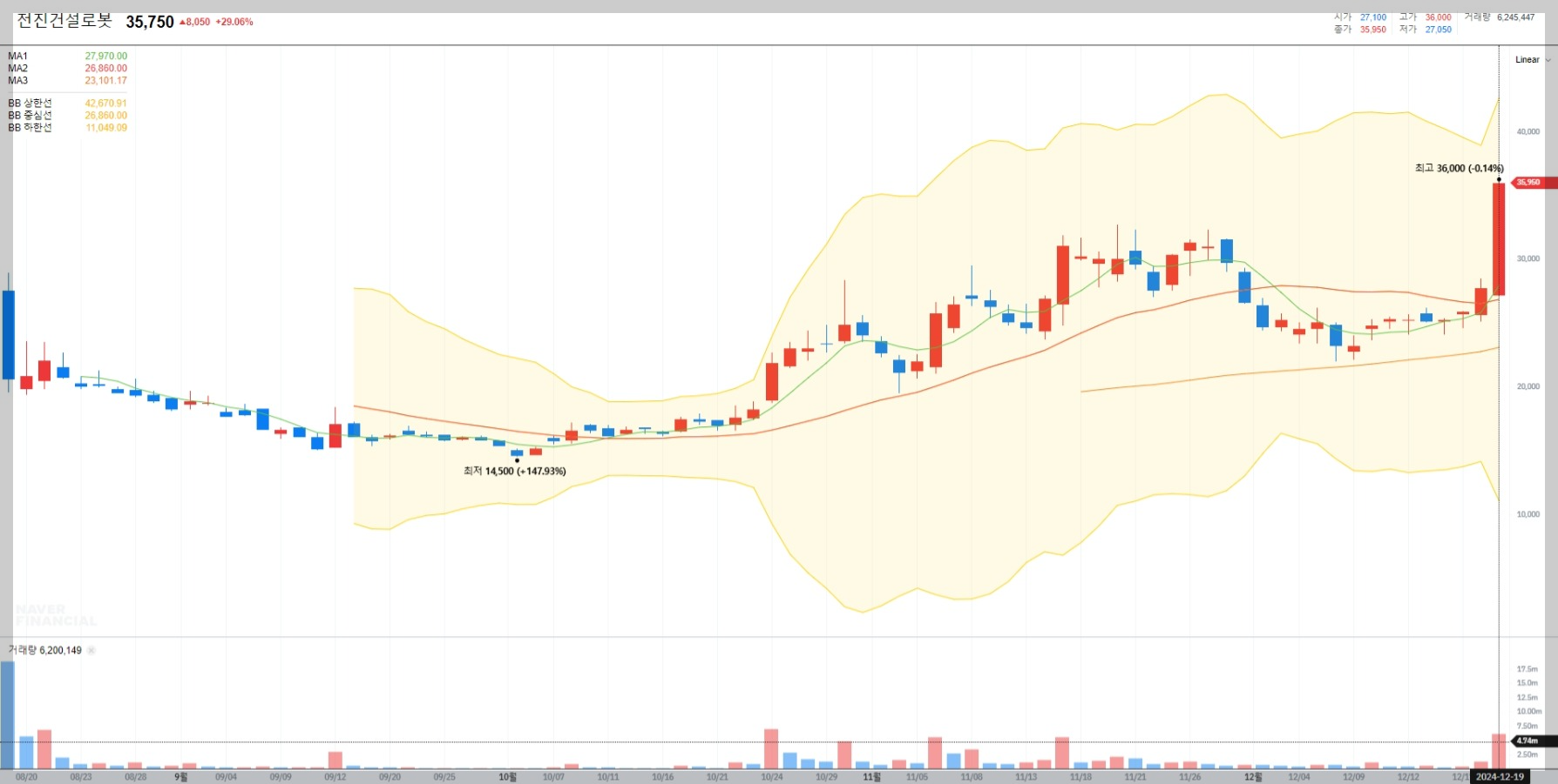 2024년 12월 19일 기준으로 전진건설로봇의 현재 주가는 35,750원으로 기록되었습니다. 이는 최근 몇 달간 꾸준한 상승세를 보여준 결과입니다. 특히 볼린저밴드 상단을 돌파하며 강한 상승 모멘텀을 유지하고 있습니다.