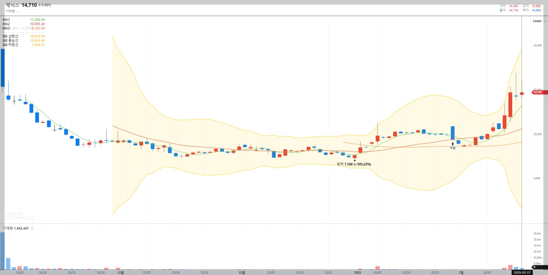 2025년 2월 현재 제닉스의 주가는 14,710원으로 기록되고 있습니다. 이는 최근 몇 달간 큰 상승세를 보이며 투자자들의 관심을 끌고 있습니다.