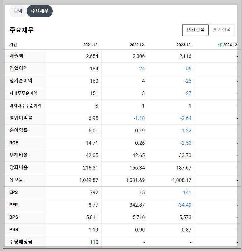 2023년 기준 제이씨현시스템의 매출액은 2,116억 원으로 전년 대비 소폭 증가했으나 영업손실(-56억 원)과 순손실(-26억 원)이 발생했습니다. ROE는 -2.53%로 부진한 실적을 보이고 있으며 부채비율은 안정적인 33.70% 수준입니다.