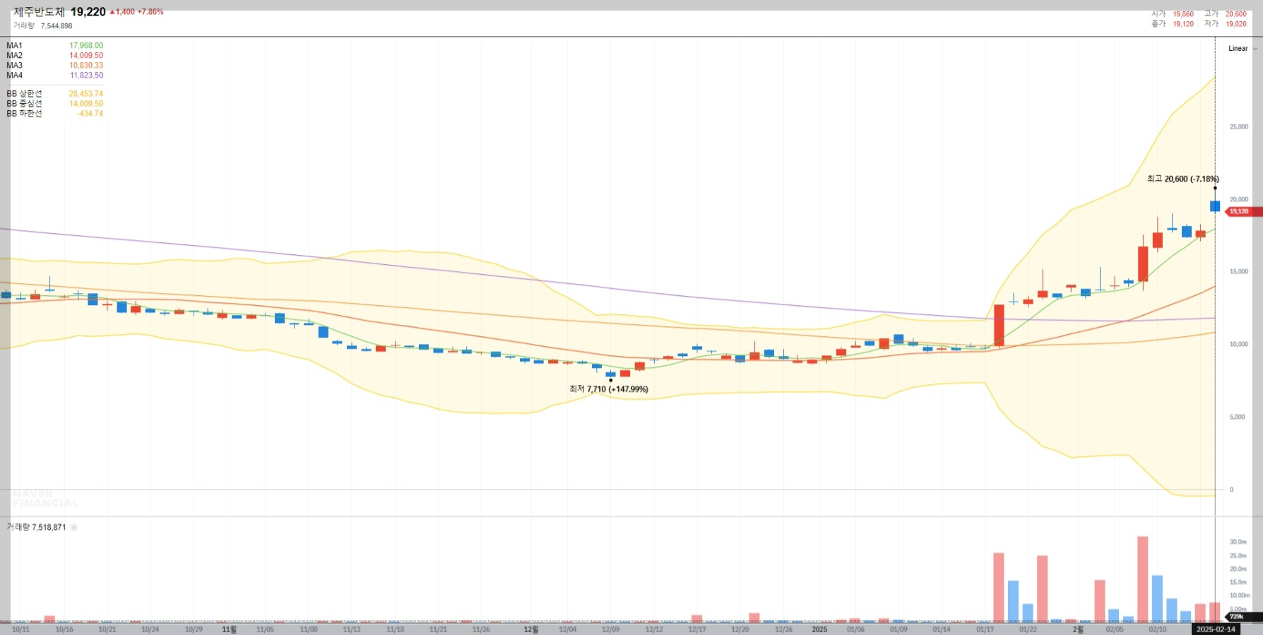 2025년 2월 기준 제주반도체의 주가는 19,220원으로 최근 상승세를 보이고 있습니다. 이는 온디바이스 AI 시장 성장과 IoT 수요 증가에 따른 긍정적 전망이 반영된 결과입니다.