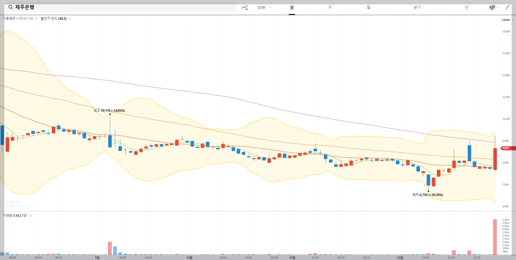 현재 제주은행의 주가는 8,640원으로 거래되고 있으며, 최근 급격한 변동성을 보였습니다. 특히 6,750원까지 하락한 후 반등하며 단기적인 상승세를 기록했으나 여전히 불확실성이 존재합니다.
