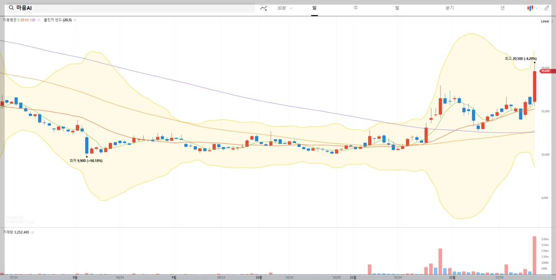 마음AI의 현재 주가는 15,620원으로 최근 몇 달간 상승세를 보이고 있습니다. 특히 2024년 12월 들어 거래량이 급증하며 투자자들의 관심이 높아졌습니다.
