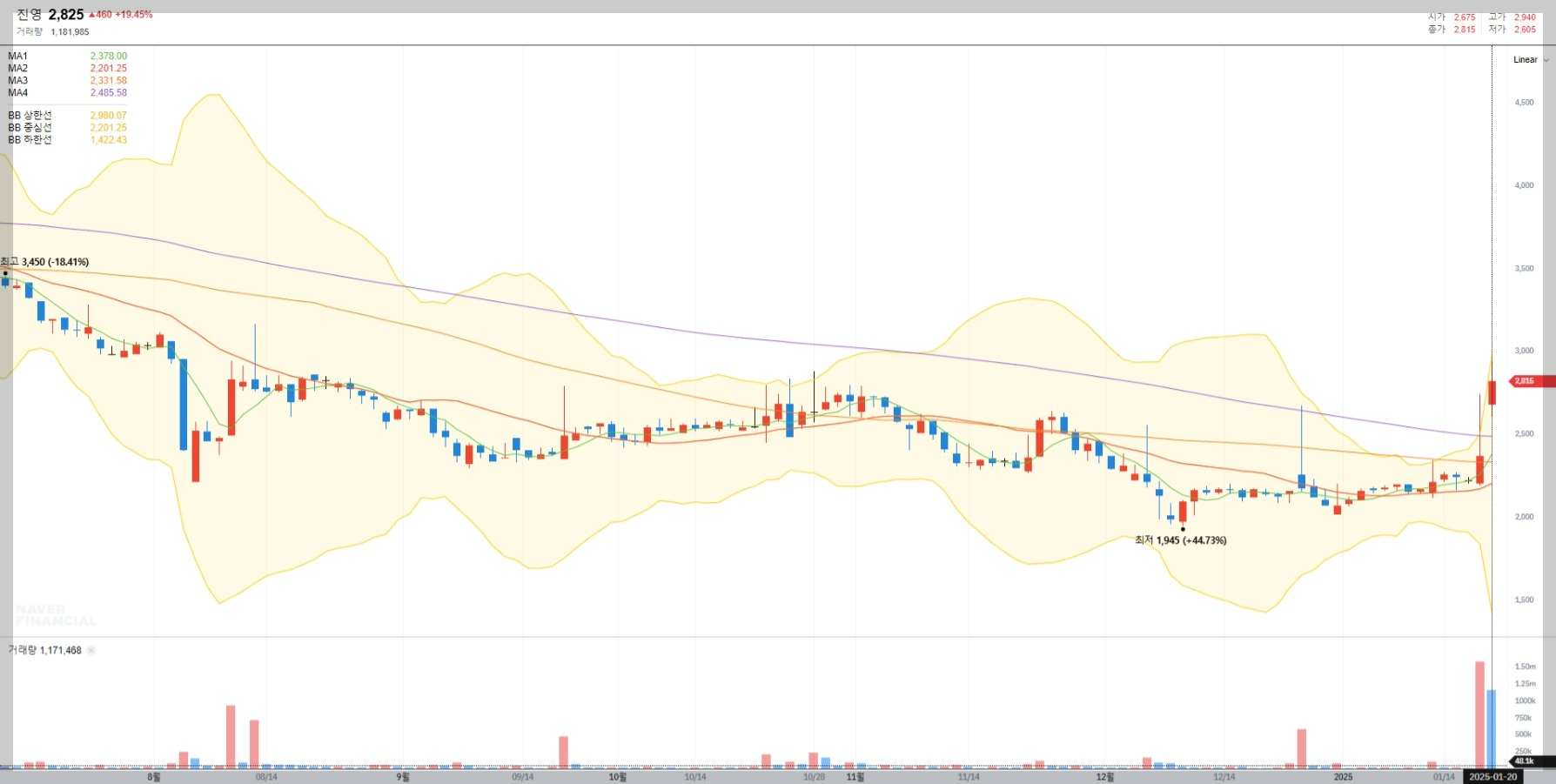 2025년 1월 20일 기준 진영의 주가는 2,825원으로 전일 대비 19.45% 상승했습니다. 이는 최근 거래량 증가와 함께 단기적인 상승 모멘텀을 보여줍니다.