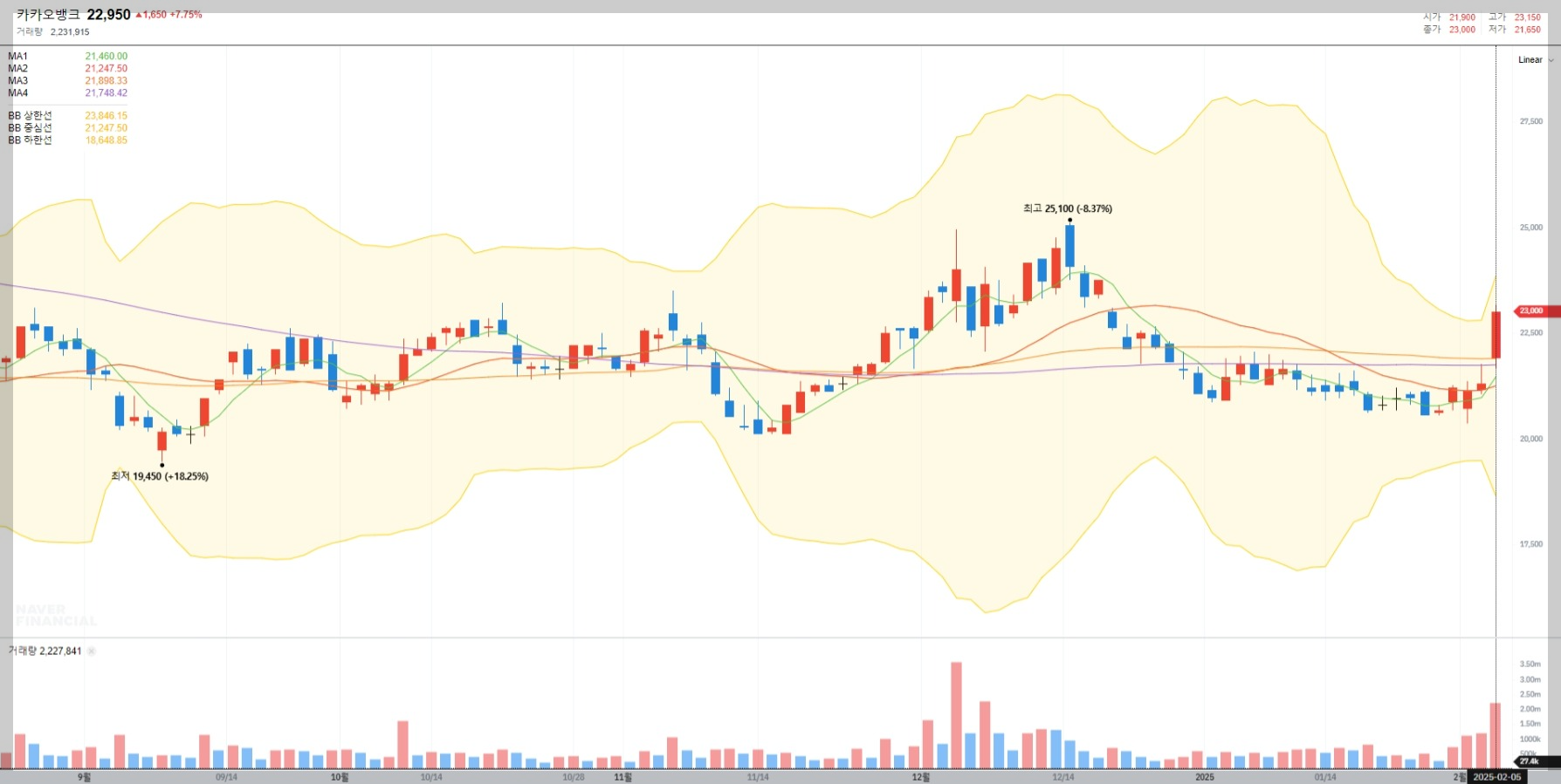 볼린저밴드 매매기법은 변동성을 활용한 기술적 분석 도구로, 카카오뱅크의 최근 차트를 보면 상단 밴드에 근접하며 상승 추세를 보이고 있습니다. 이는 추가 상승 가능성을 시사하지만 과매수 신호로도 해석될 수 있으므로 신중한 접근이 필요합니다.