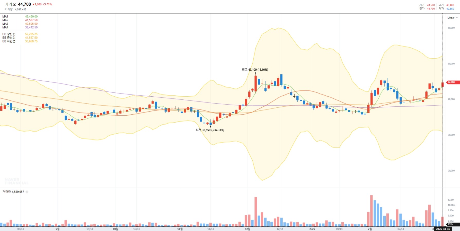 2025년 3월 6일 기준, 카카오의 주가는 44,700원으로 최근 몇 달간 변동성이 컸습니다. 이는 법적 리스크와 시장 경쟁력 약화로 인한 결과로 보입니다.