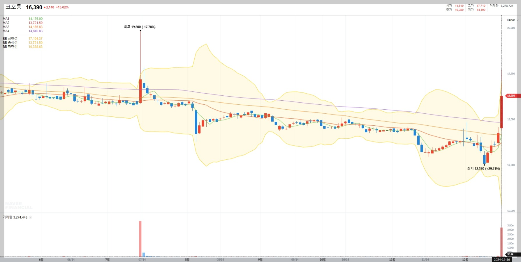 2024년 12월 16일 기준 코오롱의 종가는 16,390원으로 전일 대비 15.02% 상승했습니다. 거래량은 약 3,278,724주로 급등세를 보였습니다. 이는 단기적인 투자 심리 변화와 함께 기술적 지표의 영향을 받은 결과로 보입니다.