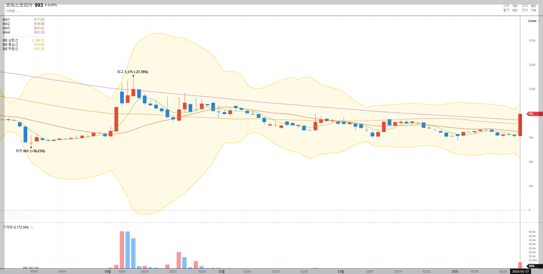 2025년 1월 17일 기준으로 코퍼스코리아의 주가는 상한가를 기록하며 993원에 도달했습니다. 이번 글에서는 코퍼스코리아의 기업 개요, 최근 뉴스, 재무 지표 분석과 함께 볼린저밴드 매매기법을 활용한 주가 전망 및 목표 주가를 심층적으로 살펴보겠습니다.