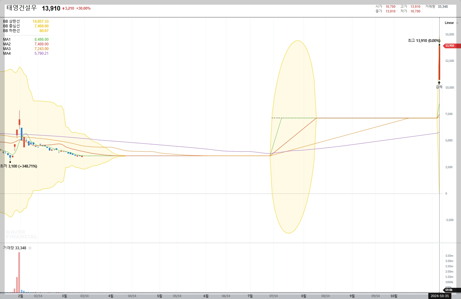 2024년 10월 31일 현재, 태영건설우의 주가는 13,910원으로, 전일 대비 30.00% 상승하였습니다. 이러한 주가 변동은 워크아웃 절차의 완료와 연관되어 있습니다.