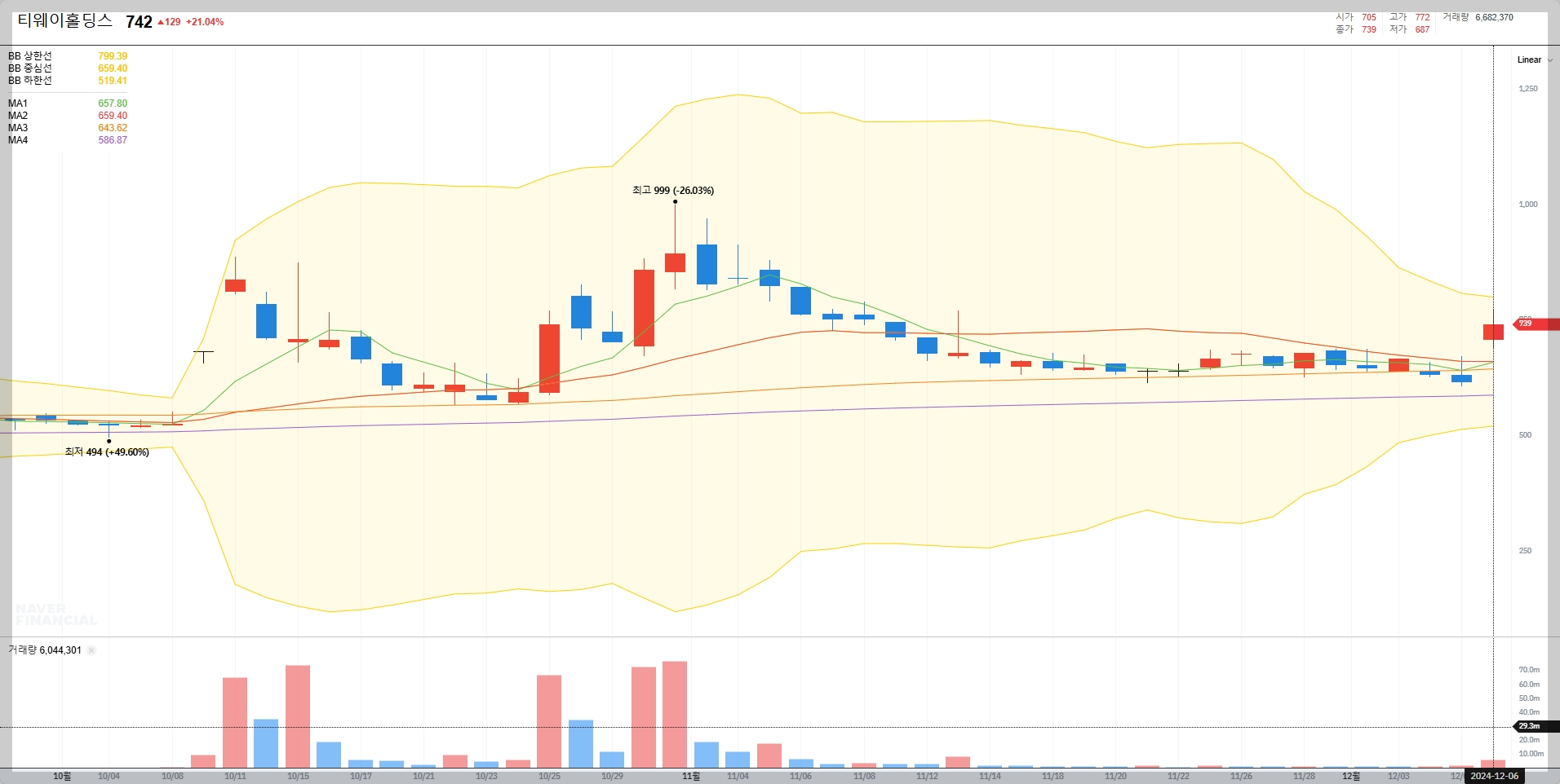 12월 6일 기준 티웨이홀딩스의 주가는 742원으로 전일 대비 21.04% 상승했습니다. 볼륨 증가와 함께 단기적인 상승세를 보이고 있으나, 변동성이 높은 상황입니다.
