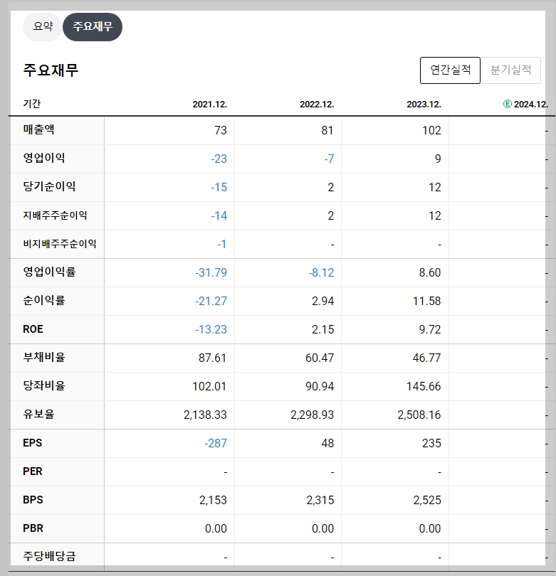 - 2023년 매출액: 102억 원