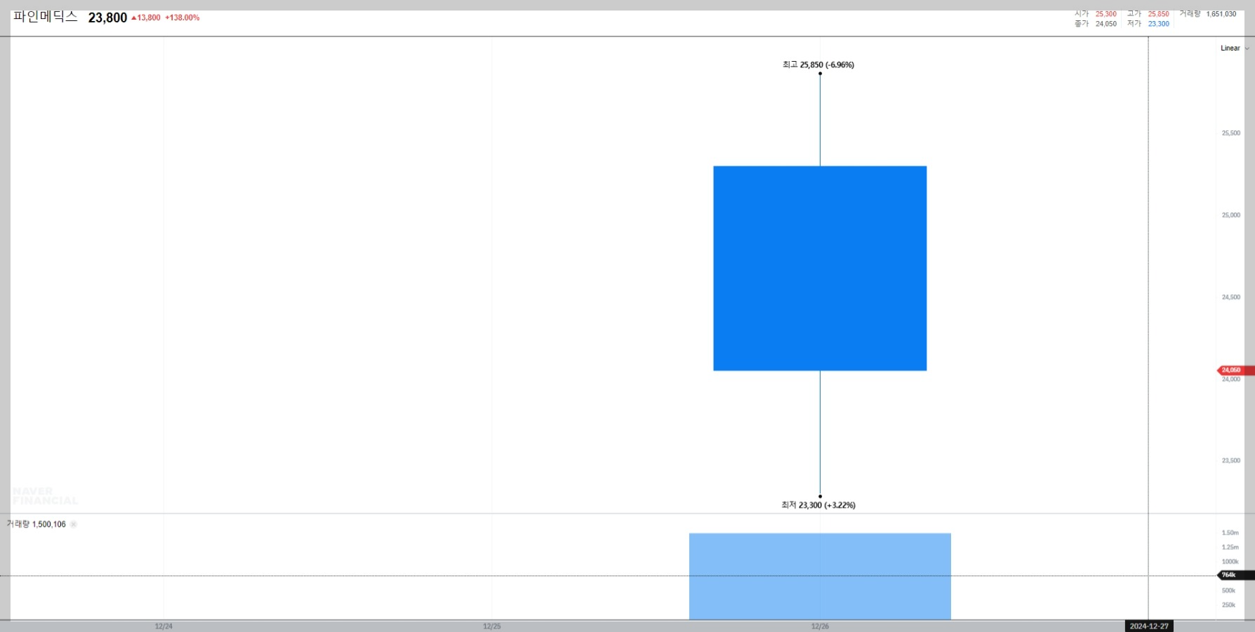 상장 첫날 파인메딕스의 종가는 23,800원으로 공모가 대비 약 138% 상승 중입니다. 거래량은 약 165만 주로 활발한 거래를 보이고 있습니다.