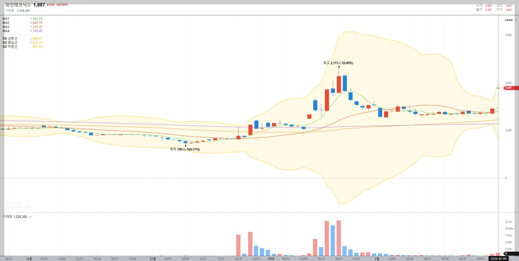 파인테크닉스의 현재 주가는 1,887원으로 최근 급등세를 보였습니다. 특히 2025년 초 최고점인 2,315원을 기록한 이후 조정 국면에 들어섰습니다. 거래량은 꾸준히 증가하고 있으며 이는 투자자들의 관심이 계속되고 있음을 보여줍니다.