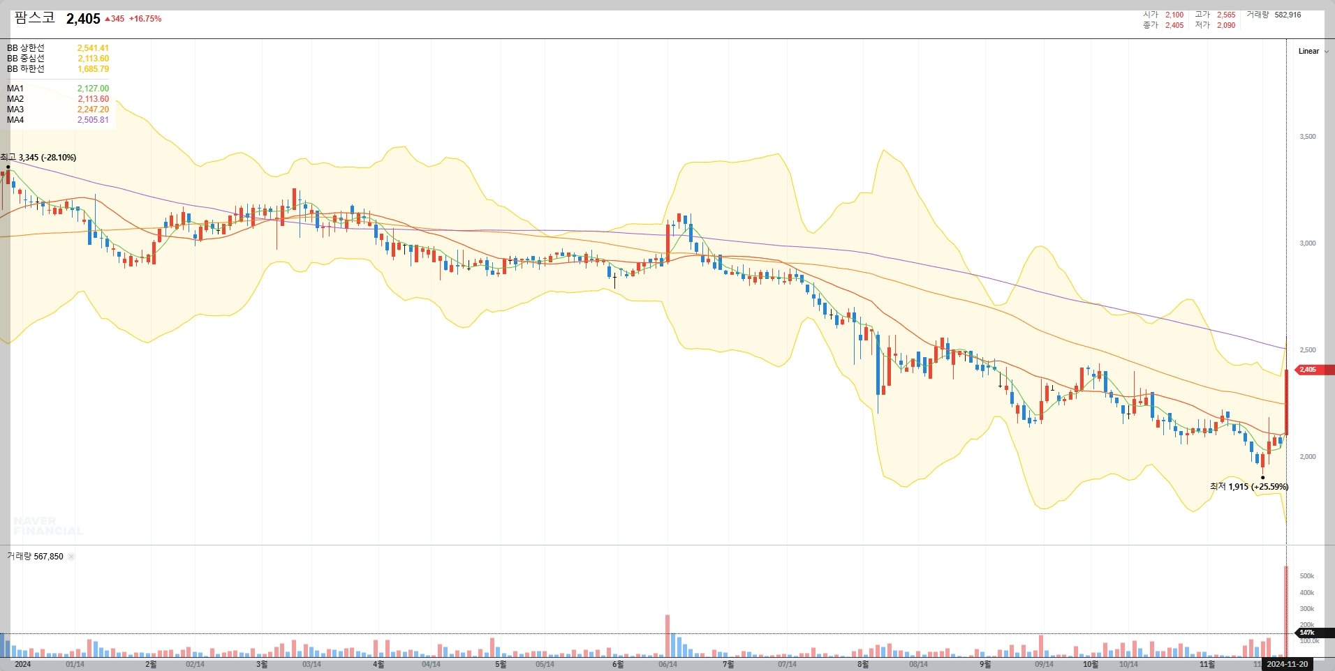 2024년 11월 20일 기준으로 팜스코의 주가는 2,405원입니다. 이는 최근 최저점인 1,915원에서 반등한 결과로 보이며, 볼린저 밴드 상 하단을 오가는 변동성을 보여주고 있습니다.
