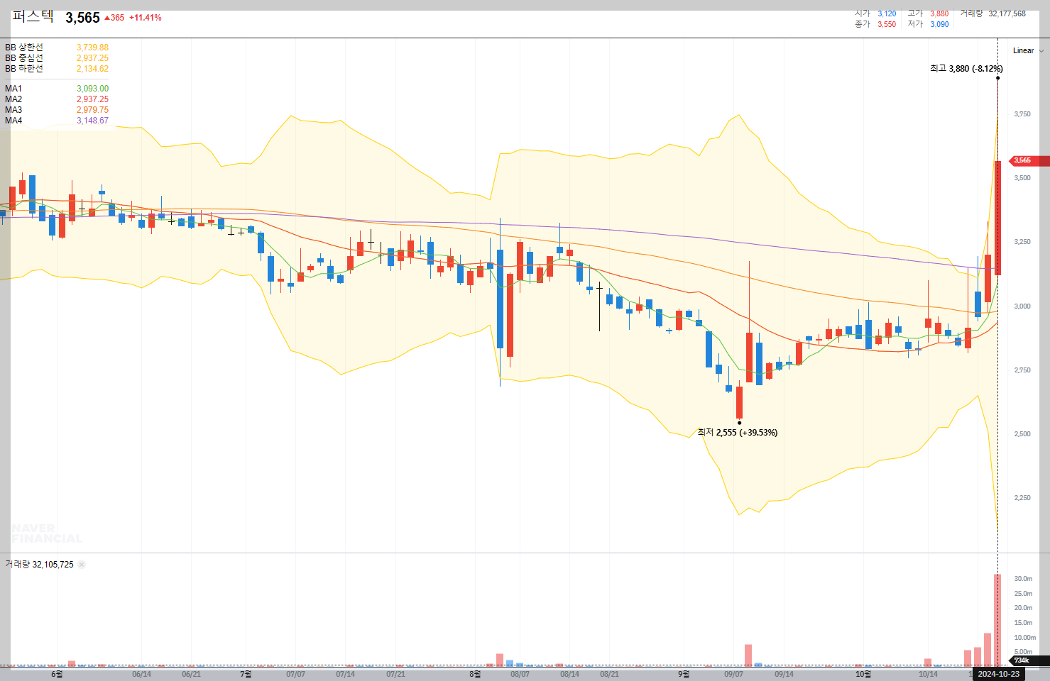 퍼스텍의 현재 주가는 3,565원이며, 최근 3개월 동안의 일평균 거래량이 두 배 이상 증가하고 있습니다.