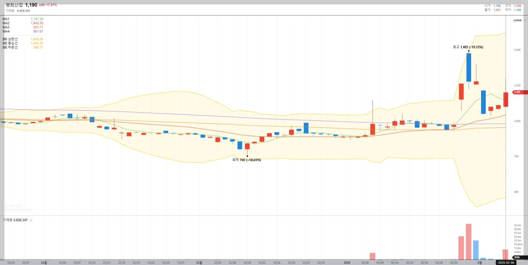 2025년 2월 6일 기준 평화산업의 현재 주가는 1,190원으로 최근 한 달간 약 40% 상승했습니다. 거래량 증가와 함께 기술적 분석에서 상승 신호를 보이고 있어 추가 상승 가능성이 점쳐지고 있습니다.
