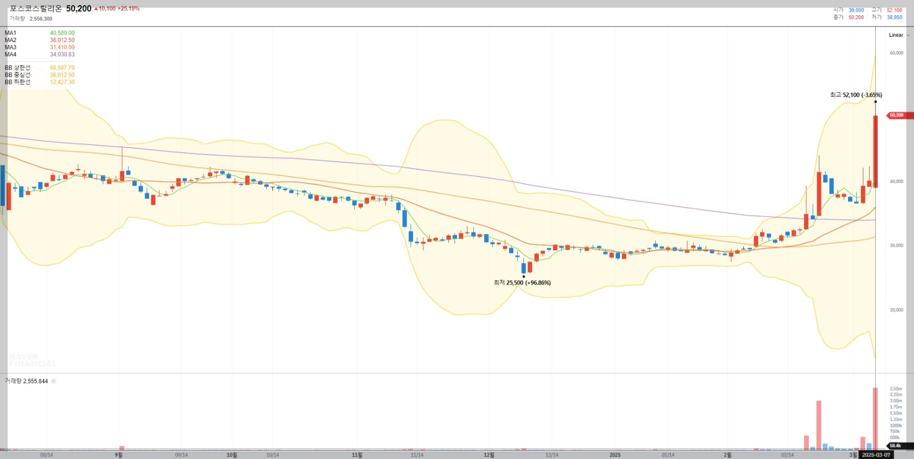 현재 포스코스틸리온의 주가는 50,200원으로 최근 저점인 25,500원에서 약 96.86% 상승했습니다. 이는 시장에서의 긍정적인 기대감과 더불어 기술적 반등이 이루어진 결과로 보입니다.