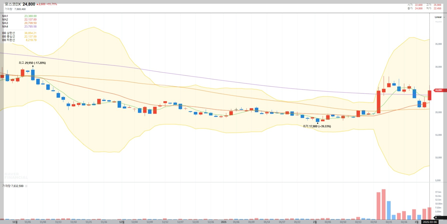 2025년 3월 6일 기준 포스코DX의 현재 주가는 24,800원으로 전일 대비 11.71% 상승했습니다. 이는 최근 거래량 증가와 투자자들의 관심이 집중된 결과로 보입니다.