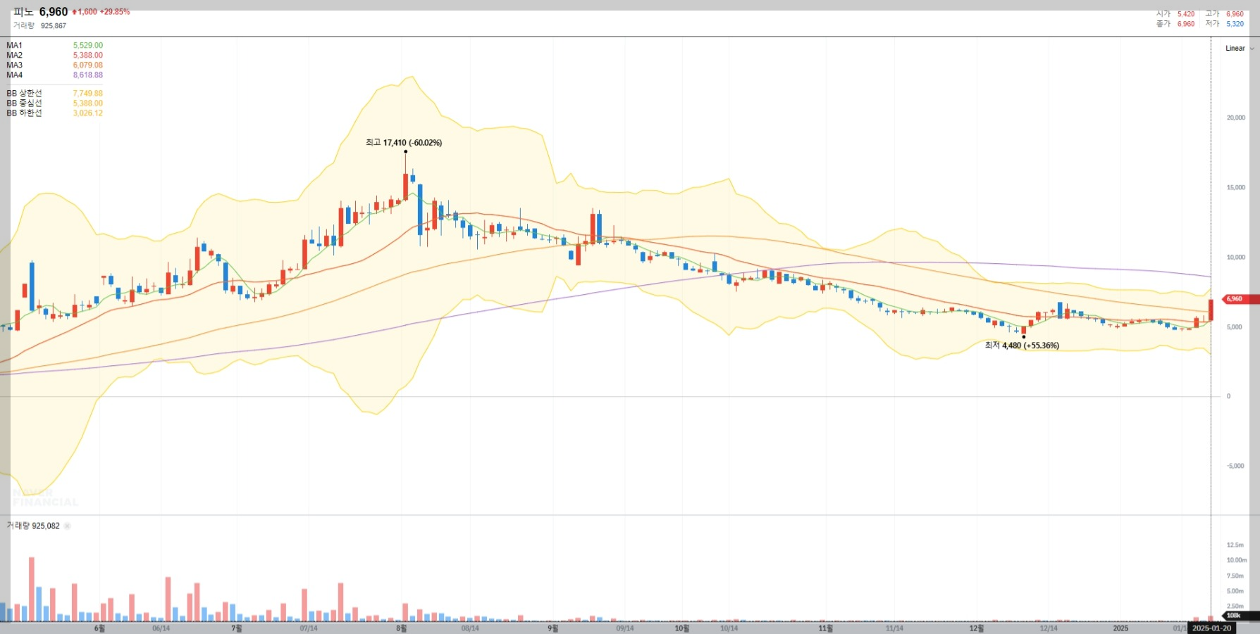 2025년 1월 20일 기준 피노의 주가는 6,960원으로 전일 대비 29.85% 상승하며 상한가를 기록했습니다. 최근 거래량 증가와 외국인 매수세가 강하게 나타나고 있습니다.